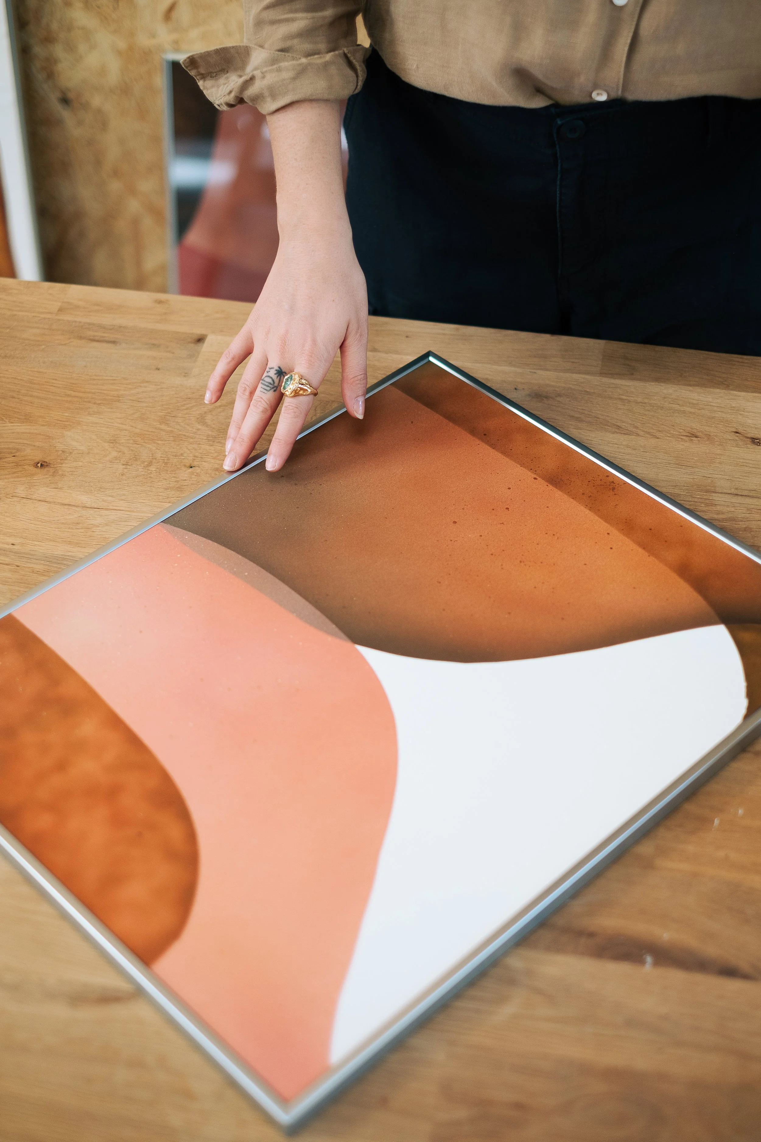 Je suis très inspirée par la culture méditerranéenne. J’aime faire référence à la terre et à la poterie. Je dessine des amphores aux courbes féminines qui représentent des vases abstraits et une ode à la culture primitive. J’aime voir mon travail comme un retour aux sources et je travaille la couleur comme un coucher de soleil. Le répertoire de Matisse, Soulages et Brancusi m’inspire énormément. Au-delà de ces références, je suis imprégnée par mon terroir et ma région. J’habite à Bordeaux, la ville du vin qui m’inspire la palette de roses lumineux aux marrons chauds, rappelant les couleurs et la terre d’où émergent la vigne.